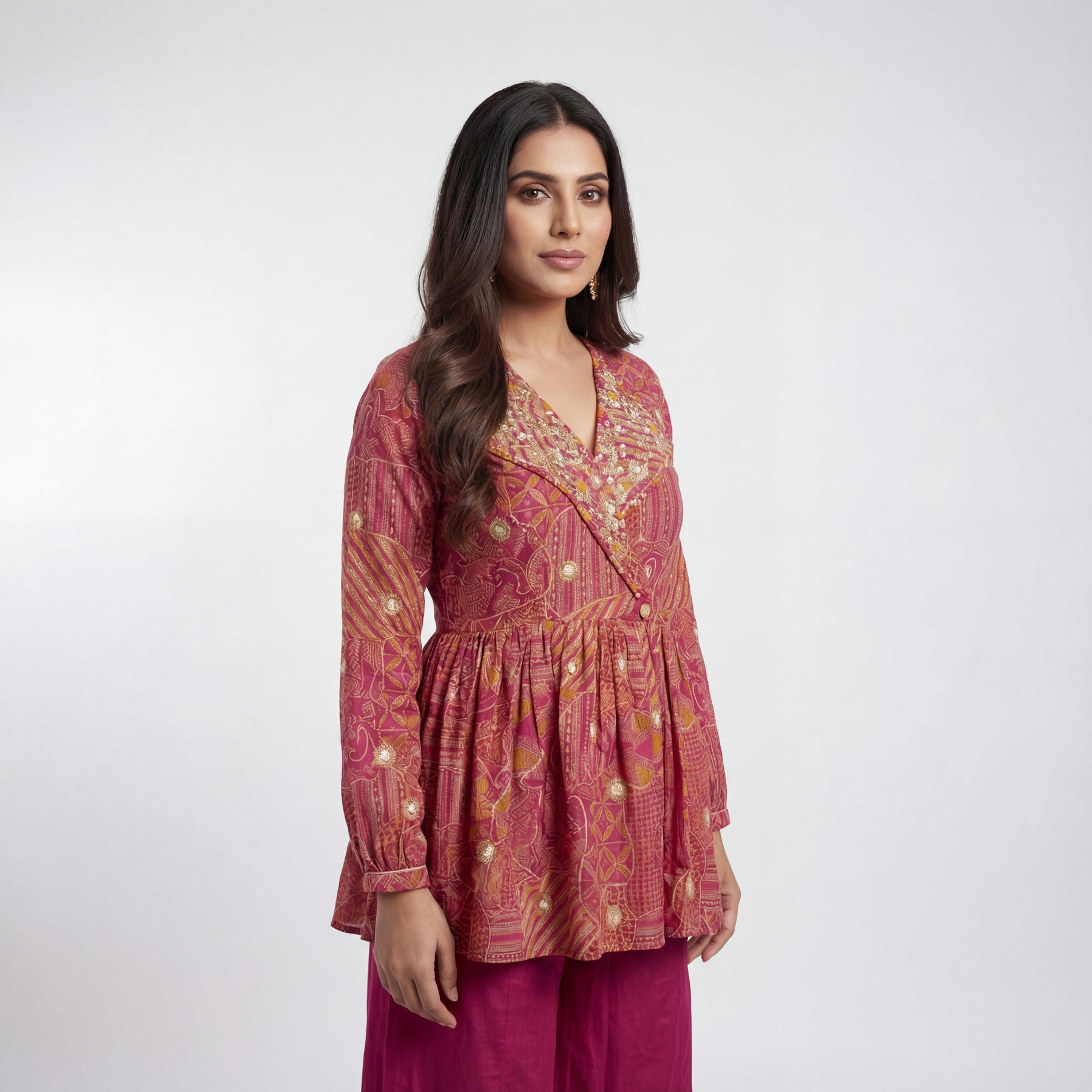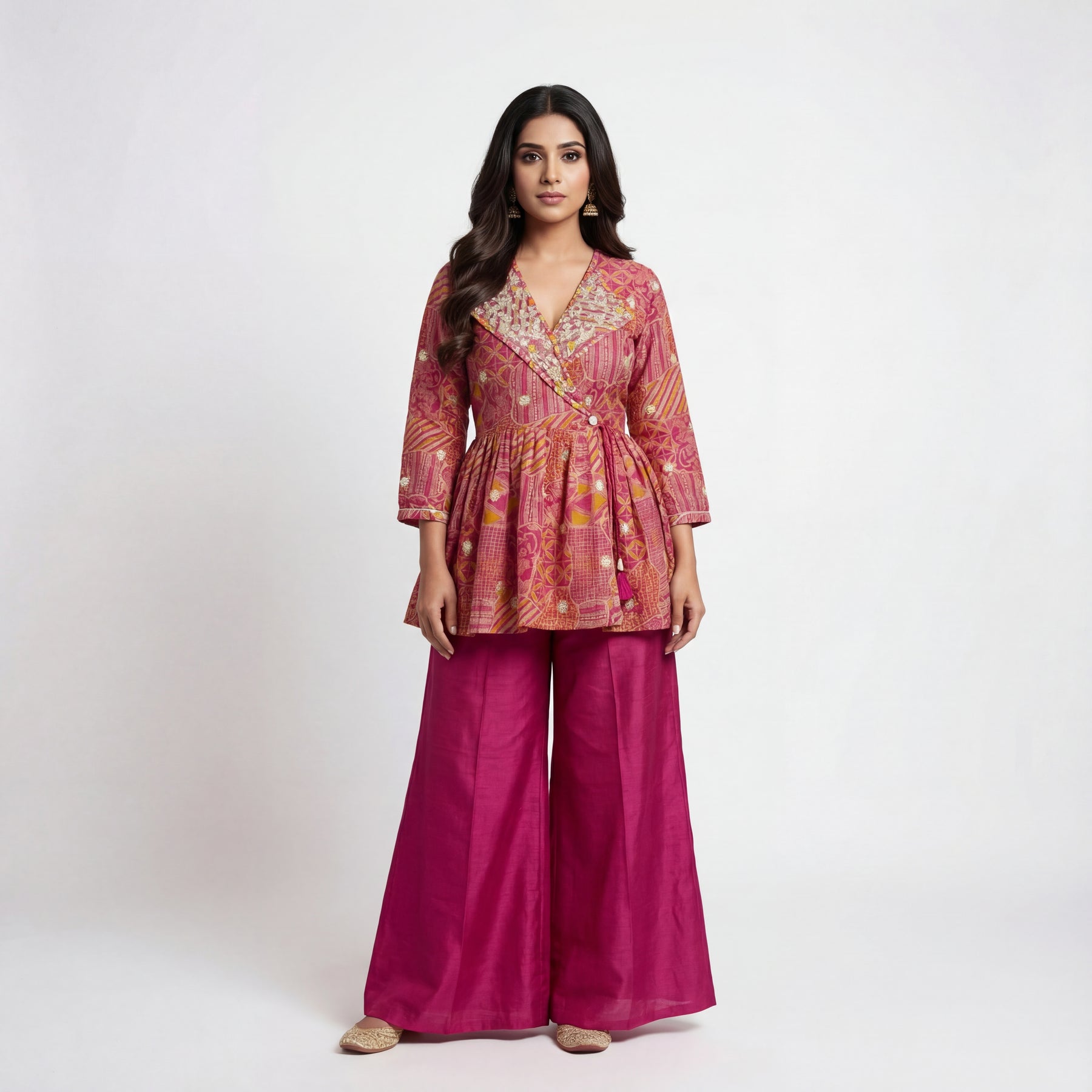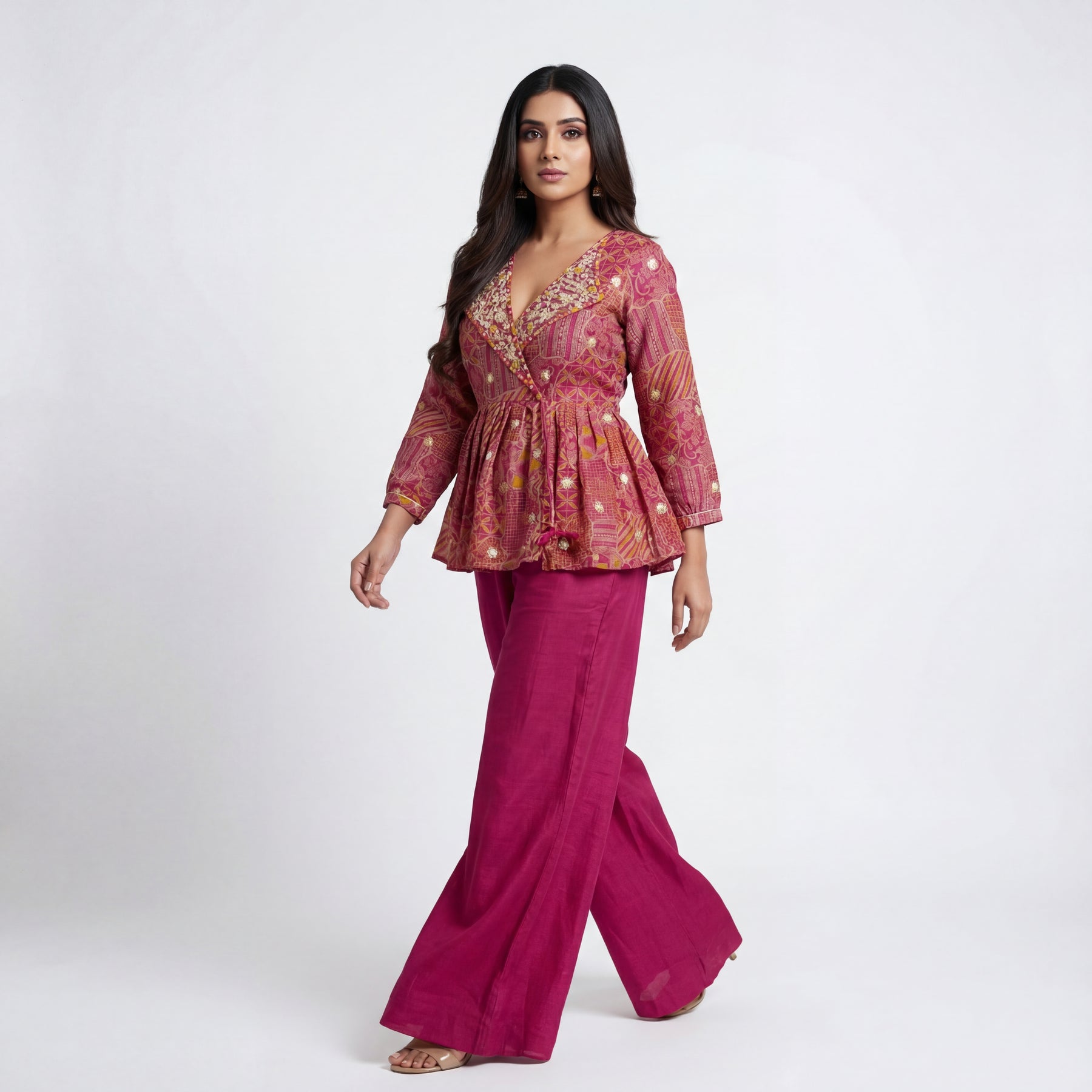Bright, vibrant, and effortlessly chic — this rani pink peplum set is designed for modern celebrations. The printed peplum top adds structure and flair, beautifully complemented by flowy wide-leg palazzos. Lightweight, comfortable, and stylish, it’s perfect for festive events, daytime functions, and celebratory occasions.
